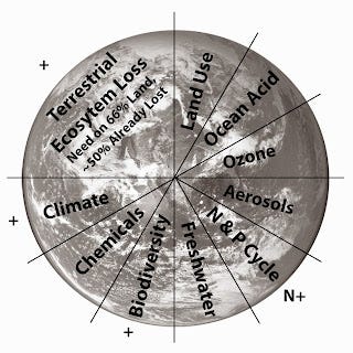 forests have been lost than the biosphere can bearA branch of ecological science known as Planetary Boundary science knows much regarding ecological thresholds whereby Earth and her life may collapse and die. Planetary boundaries have been identified for ten global-scale processes including climate change, rate of biodiversity loss (terrestrial and marine), nitrogen and phosphorus cycles, ozone depletion, ocean acidification, freshwater, land use change, chemical pollution, and atmospheric aerosol loading (and others clearly exist). For each scientists have set thresholds beyond which the global ecological system’s integrity as a whole is threatened. At least three thresholds – climate change, biodiversity loss, and nitrogen deposition in ecosystems – are generally considered to already have been surpassed, meaning the planet is already in a state of ecological overshoot.