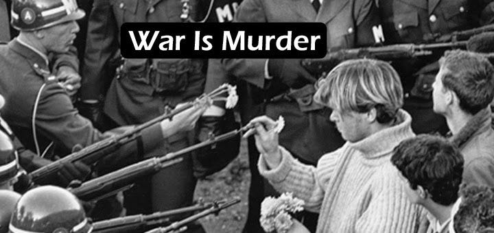 In war brainwashed young men (and now women) of one tribe hunt down and kill the indoctrinated from another tribe to serve the interests of rich old men. It doesn’t matter which gods or arbitrarily delineated nation are displayed or what rhetoric is used; war is murder. Bodies are cut and blown apart, homes destroyed, families ripped asunder, women raped, and the land, water, and air plundered as the wealthy declare a respite from the laws of humanity to further their own enrichment.